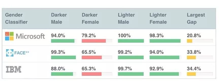 尽管过了几年人脸识别技术有较大的提升,但相较于白人,亚裔和非裔的人脸识别错误率要高10到100倍。2017年MIT实验室的一项研究也得出了类似的结果,凡遇到肤色较暗的人种以及女性,识别的错误率就增加。