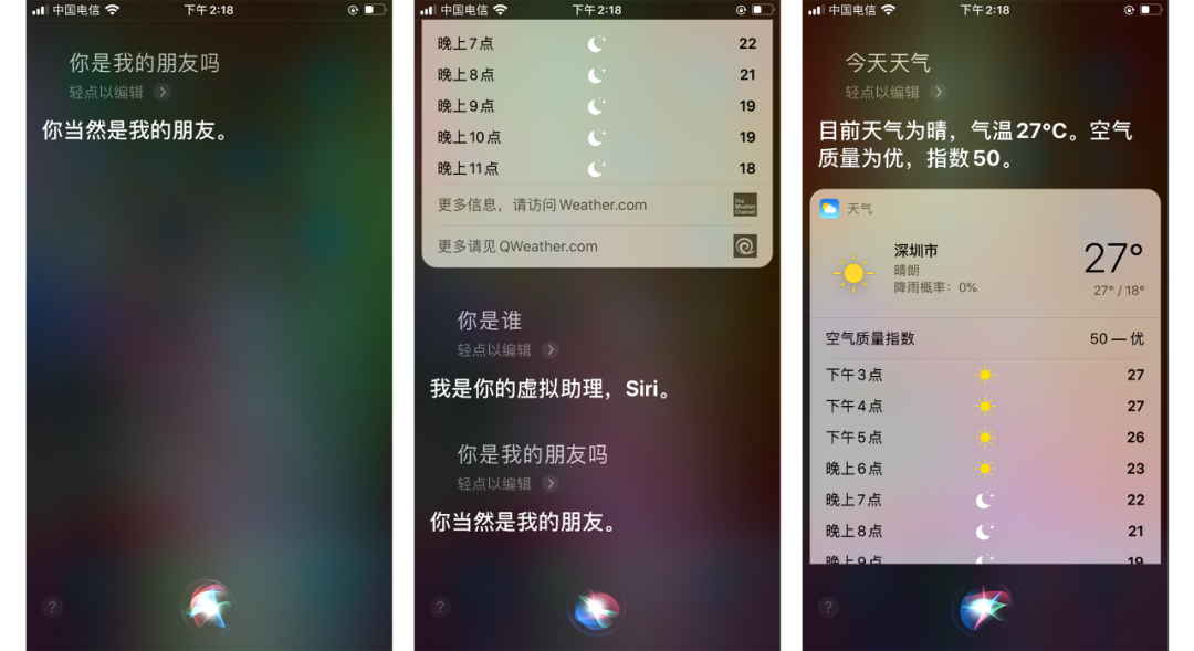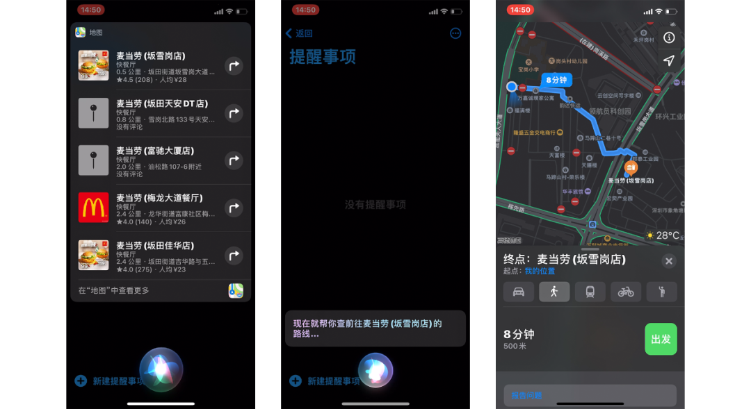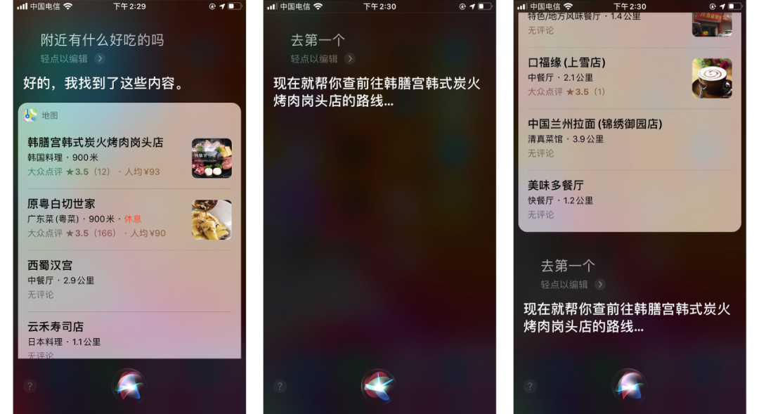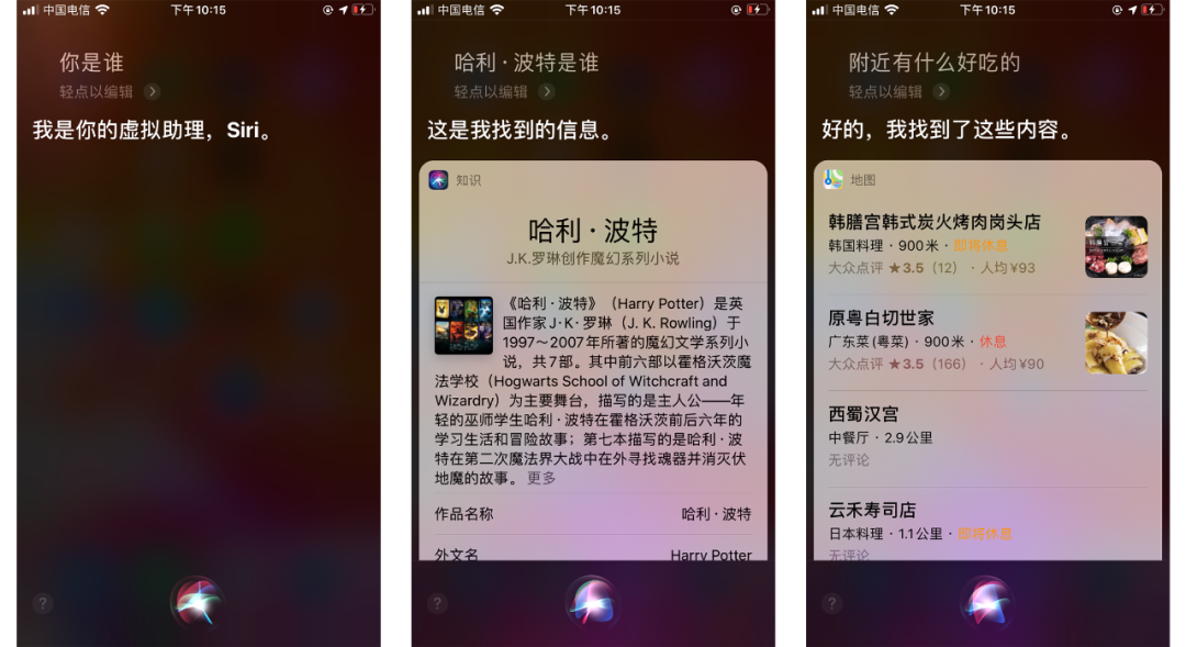 图9 iOS 13 Siri的对话以纯文本和卡片的形式展示结果
