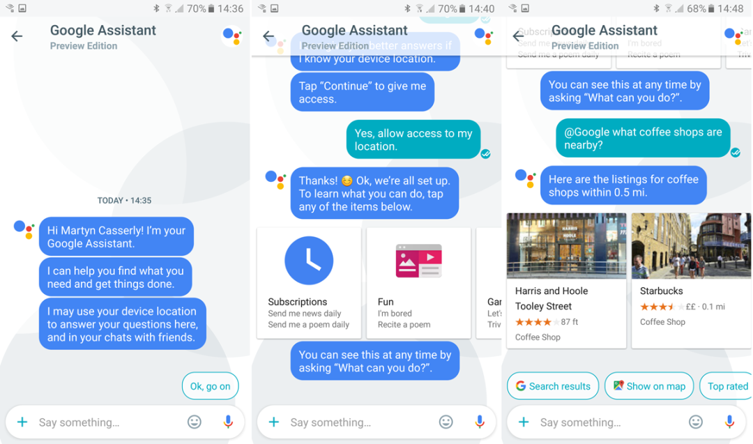 图4 Google Allo中的GoogleAssistant(左)和用户(右)的对话流
