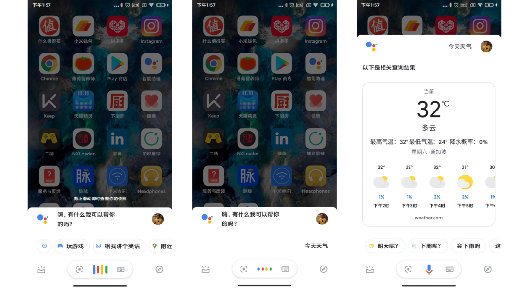 以图8为例,我们参考一下Google Assistant是如何设计ASR的。当用户激活Google Assistant时,由于用户还没开始说话所以ASR内容为空。从体验和商业两个维度进行考虑,这时候为用户提供一些提示词是有好处的;而且提示词也属于用户想说的内容,所以提示词可以直接利用显示ASR的区域,如图8中的第一张图。当用户不点击提示词而开始说话的时候,ASR区域内的提示词会自行消失并实时显示用户说的内容,如第二张图。当发现用户停止说话时,系统会将ASR内容和搜索结果一并显示在第三张图中,此时ASR区域会清空文字并显示相关的提示词引导用户发起下一轮对话。
