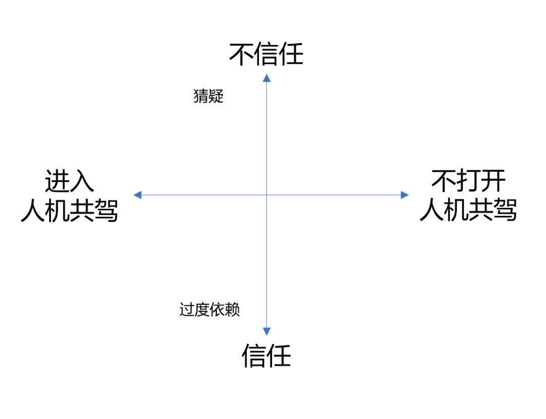 在智能座舱领域,人类和机器的关系可以抽象为下图,当人对机器越不信任,在辅助驾驶过程中会一直担心汽车出现问题,从而产生焦虑感和注意力分散,对变化的响应会越迟钝;当人对机器过度信任,在辅助驾驶过程中会太过依赖汽车的决策,渐渐地注意力分散到其他事情上,两种现象都不是我们希望看到的,因此什么是合理的人机信任以及如何校准人机信任将是设计辅助驾驶时很重要的课题。
