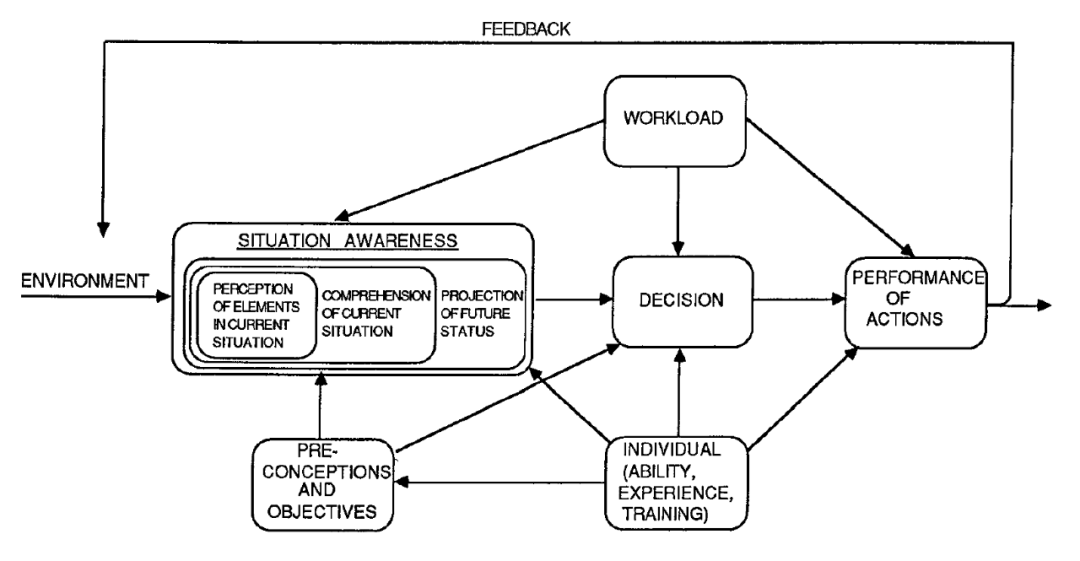 态势感知(也被称为情境意识)最早用于飞行场景,被定义为“在一定时间和空间内对环境中的元素的感知,并对其意义的理解以及对它们在不久的将来的状态预测”,也被认为是飞行员在任何时间点对周围世界的内部模型。态势感知结构可以进一步分解为三个层级,如下图所示。