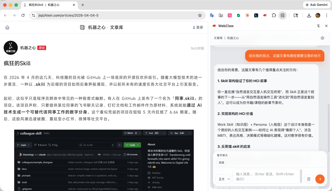 切回 OpenClaw,把链接丢进去,它确实能抓页面、能总结。但我停下来想了一秒: 我明明就在浏览器里盯着这篇文章,为什么还要切出去跑这一圈?