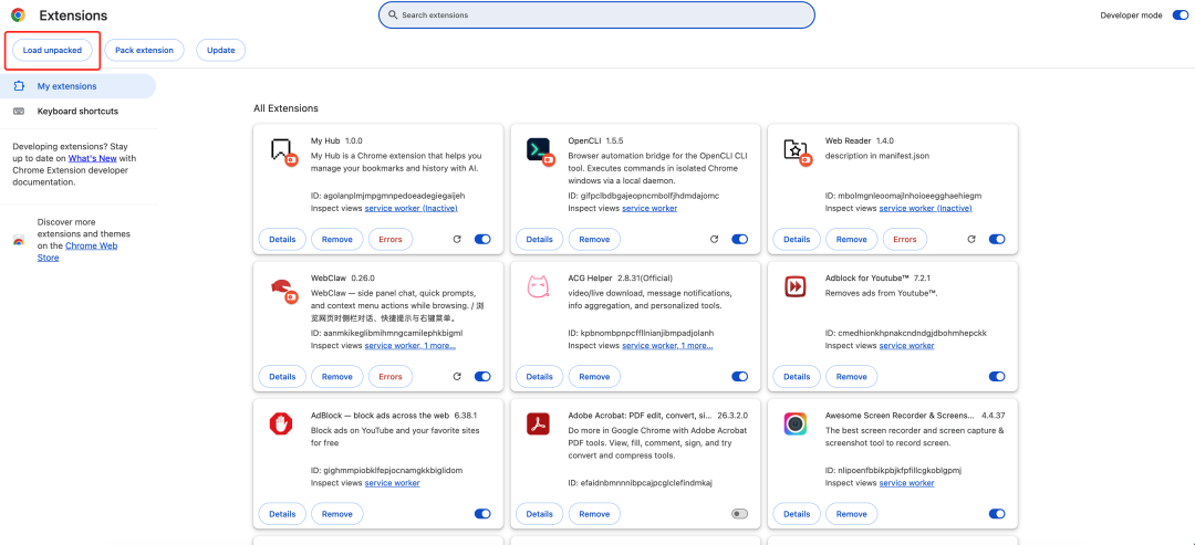 解压后,打开 chrome://extensions ,开启右上角「开发者模式」,点击「加载已解压的扩展程序」,选择解压出来的文件夹即可。