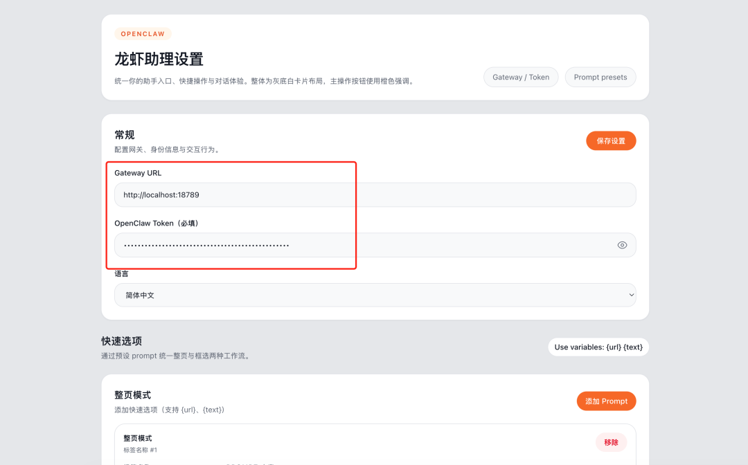 网关地址 :默认 ` http://localhost:18789 ` Token :你在 OpenClaw 中设置的鉴权 Token
