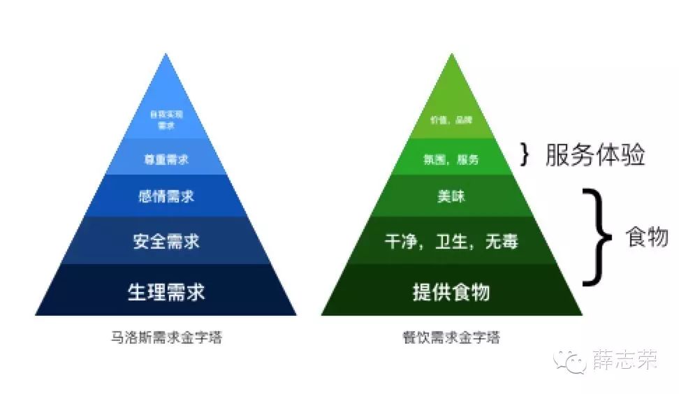 由美国心理学家亚伯拉罕·马斯洛在1943年在《人类激励理论》论文中所提出的马洛斯需求金字塔,将人类需求像金字塔一样从低到高按层次分为五种,分别是:生理需求、安全需求、感情需求、尊重需求和自我实现需求。将五需求与餐饮相联并推导,从低到高往上则为一:提供食物、二:干净,卫生,无毒、三:美味、四:氛围,服务、五:价值,品牌。可看出食物在餐饮行业内只是需求的基层,服务体验才是体现价值和提升为众人皆知品牌的重要一环。