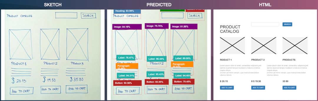 2017年UIzard开源了一款名叫pix2code的神经网络工具,它能将界面截图翻译成界面代码;2018年Airbnb和微软相继发布了自己的最新研究成果,设计师可以通过草图直接生成界面代码,减少视觉稿设计、前端开发的工作量。基于草稿的界面生成主要原理是找到手绘控件和系统控件样式之间的规律,然后寻找草稿中控件的布局关系,最后翻译成界面布局和页面代码。微软开源了相应的代码Sketch2Code,看起来很美好,但体验过后发现Sketch2Code的效果并不理想,主要有以下几点: