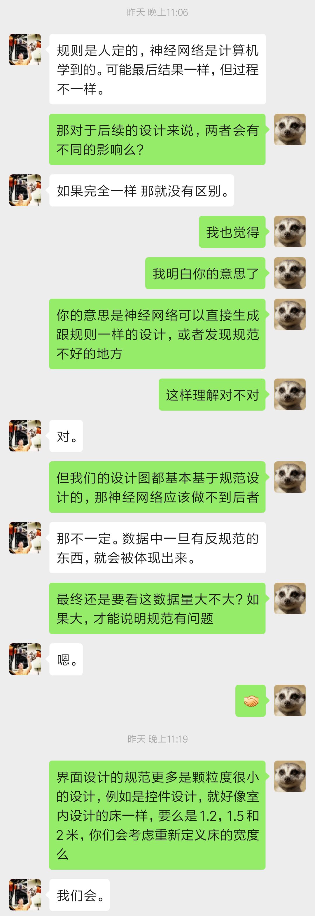 最后和郑豪博士聊了一下公式内容,按照郑豪博士的说法 “ 暴力数学拟合 ” ,看完他给的公式后简直无力反驳。但过后我陷入了沉思: 既然这条公式这么简单粗暴,为什么要花费如此大精力要计算机自己学习人类的经验呢? 为什么不直接把已有的经验传授给机器? 目前大部分设计都和几何设计学有关,那么我们是不是可以把几何设计等相关经验输入进去就好了?基本上所有小屏设计的规律都是有规律所寻的,那就是各平台的设计规范。如果我们把大量的基于Android和iOS规范的设计截图输入到神经网络里进行深度学习,最后得到的结论可能就是每一个控件的样式和设计规范类似,那么我们为什么不直接把现有的Android和iOS设计规范梳理成规则告诉计算机呢?以下是郑豪博士的见解: