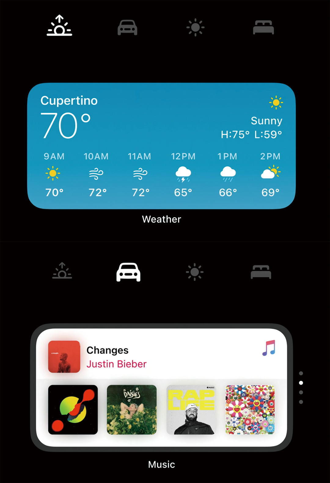 苹果还允许用户将几个不同的Widget添加到同一个位置合并为一个智能堆栈。在基于用户的行为和使用场景的基础上,智能堆栈可以在某个特定的时间自动轮换展示与用户最相关的那个小组件,这样用户在桌面直接看到当前最需要的信息。例如当用户醒来时可能想要知道今天的天气状况,或者在上班路上时总是播放最近喜欢的音乐,那么智能堆栈都会场景推荐相应的Widget给到用户。
