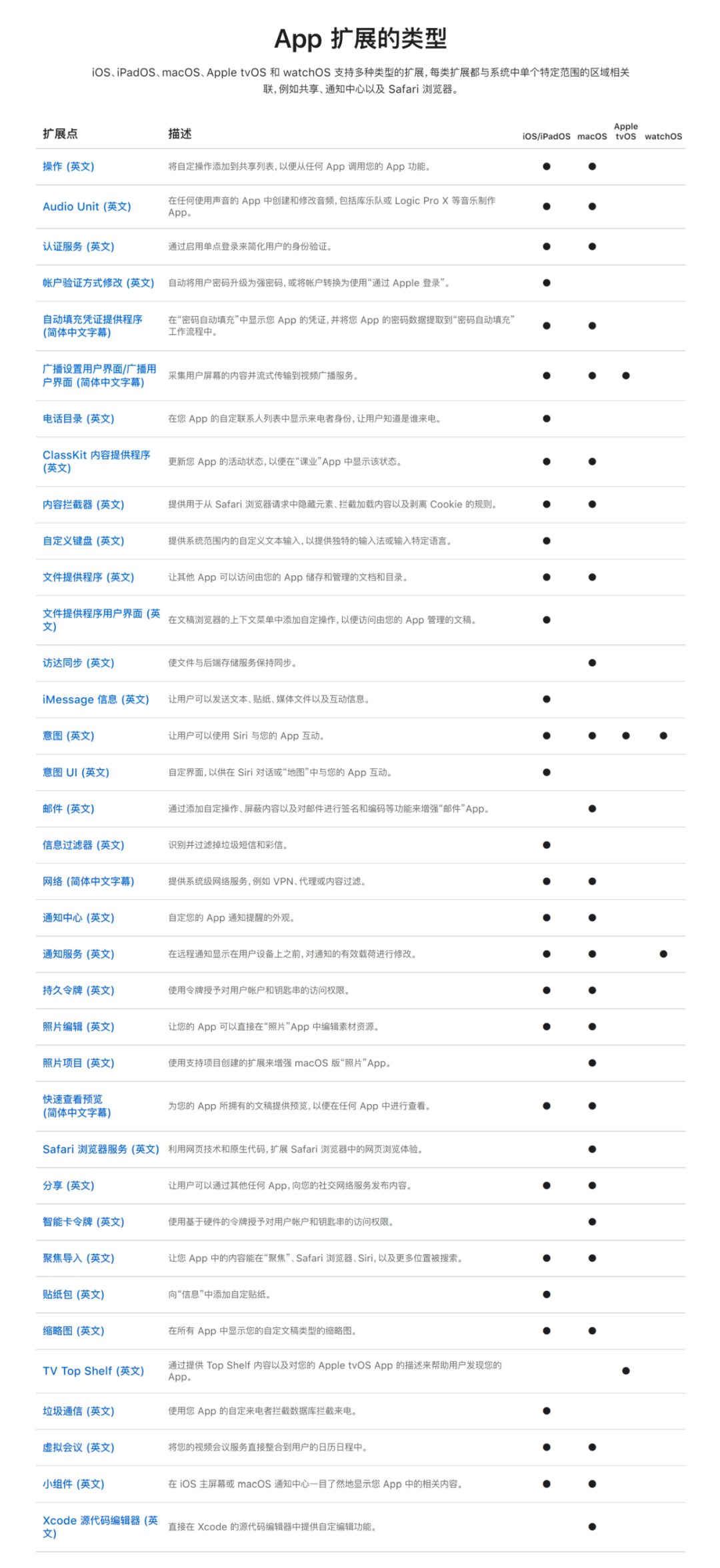 除了以上内容,其实苹果还有一部分系统功能暂时未提及,但在前文已经提及了它们也属于智能交互的一部分,那就是应用扩展,它可以让你扩展你App的自定义功能和内容,使用户可以在与其他应用或者系统进行互动的时候去使用它。应用扩展包括了共享、通知中心、邮件等等,它们能部分或者全部应用于iOS/iPadOS、 macOS、tvOS和watchOS,更多应用扩展类型可以从下图查看。