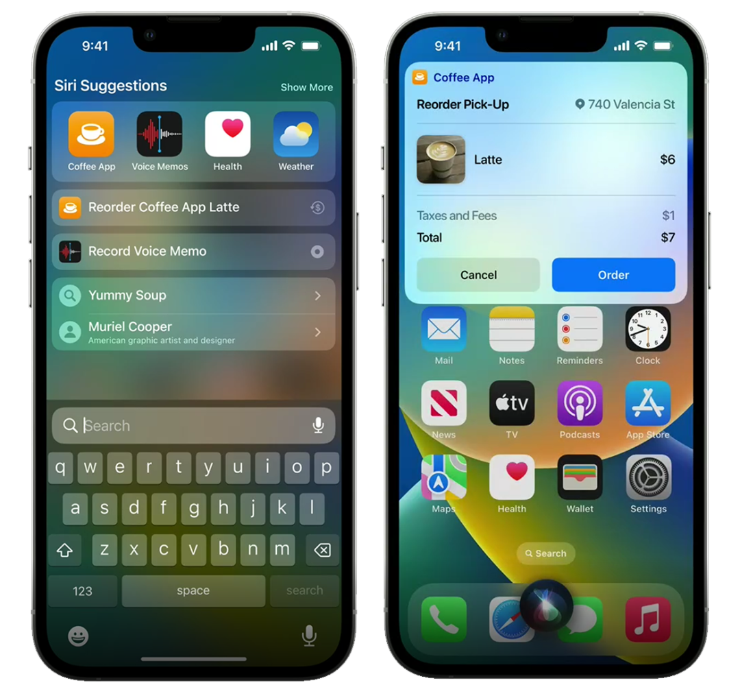 意图框架中的“执行”更多是指系统会将预测到的Intent(操作)显示应用程序带来不同的入口,它们包括Siri、Siri Suggestion、Widget和Shortcuts App,当用户点击任何一个Intent,它们都会触发相应的操作。尽管应用尚未运行也要做好相应的准备,因为Intent被系统传递给应用后应当立刻被执行。还是以刚才的咖啡下单为例,假设系统在Siri Suggestion显示了一条咖啡下单的推送信息,目的是让用户在下订单之前确认他们的订单是否正确,当用户点击后,产品应当跳到订单确认的界面。