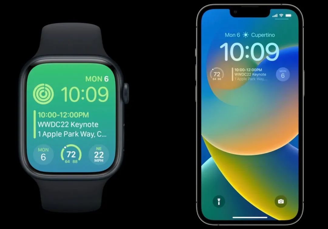 以上预测在WWDC 2021和2022上都得到了验证。 WWDC 2021推出的macOS Monterey的通知中心上允许用户添加Widget;在WWDC 2022推出的iOS 16中,Widget和通知都能显示在锁屏页上;在WatchOS 9上Widget也能显示,如下图,这些都意味着通知和Widget已经在开始融合并无缝地显示苹果多个设备上。
