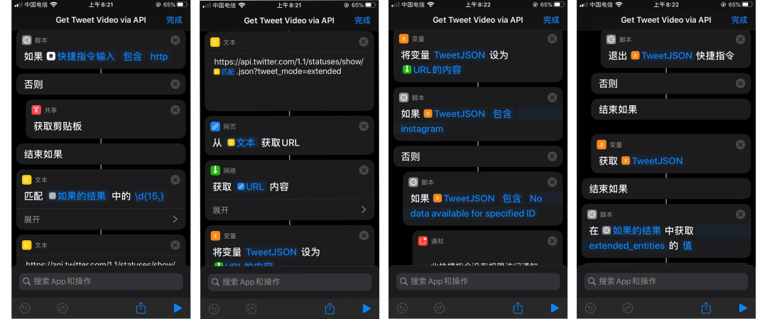当前Shortcuts已经能在iOS、iPadOS、macOS和watchOS上,但是在2022年前,Shortcuts对于大部分用户来说并不友好,首先大部分应用都没有将自己的操作和数据开放出来,尤其国内应用,例如微信截至2022年为止才开放了“发送消息”的指令,但这个也跟苹果的政策有关系。其次是Shortcuts的指令编写难度高,以下载Twitter应用中的视频为例。众所周知Twitter并不允许用户下载应用内的视频,但国外网友制作了一个Shortcuts,只要用户点击视频的分享按钮就能将视频直接下载到相册。这个Shortcuts背后涉及了约40条操作,下图是一部分逻辑,里面已经包括各种逻辑判断和URL获取,可想而知这对一个想创建Shortcuts的普通用户来说是困难的。