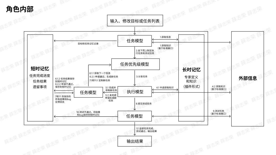 角色内部可以理解我定义了一个通用的框架,它可以基于短时记忆、目标和任务列表不断循环执行任务、测试任务、新建任务。 在这里我参考了人的认知模型增加了“长时记忆”插件新概念, 我们可以把它理解为专家的角色定义和经验的输入,也就是说当我们需要管理角色,我们将一个管理专家的卡片插进系统里,他会将用户的目标自下而上地分解成若干个任务和测试方法,同时他会决策自己需要多少个员工为自己服务。执行角色就是员工,不同员工会插入不同的专家卡片,他们会自己拆解、执行、测试和新建每一个任务。本质上,管理角色和执行角色分别在自上而下和自下而上实现用户的目标。 在图的右侧我标注了“标准接口”,我们可以理解为AGI也是一种模态,它可以跟当前的互联网、XR、我们真实空间里的信息、接口进行交互和调用,它除了可以是模拟点击、意图识别还能是什么?我认为基于图像识别的绝大部分技术都会纳入到下一时代的交互接口和事件定义里。 前阵子我一直在想一个问题,如果AGI真的到来,人机交互还能做什么?回归到人工智能和人机交互的发展史,我们可以看到人工智能和人机交互是相辅相成以及螺旋发展的,如果人工智能发生急剧地进步,那么人机交互必定也会跟随急剧进步,而不是倒退甚至没了(否则不符合几十年来的发展规律)。最近我有一个不成熟的思考,仅供各位思考:人机交互在以往更多考虑人如何使用工具,现在我们更多需要思考人和未成熟自治系统的协作,如果大家不太理解,我们可以把未成熟 自治 系统理解为小孩,重心是包容和协作,而不是命令和使用。也就是说在未来,我们应该把 自治 系统看成有能力差异的员工或者同事,而不是工具。 标题是 《 Next Thing:角色+模型+流程+接口调用 》 ,Next Thing很明显是 自治 系统,构建它的前提是我们基于严谨的逻辑实现角色内部机制,包括构建可以被实现的模型、流程和接口,接着基于社会关系实现角色之间的配合。在不久的将来(可能是一个月后),我们将有好多的员工为我们服务,这意味着你将成为老板并解放自己的劳动力(前提是你得找到好的员工并且付钱给员工,因为调用各种API和GPT以及购买一台高性能的电脑需要花钱)。