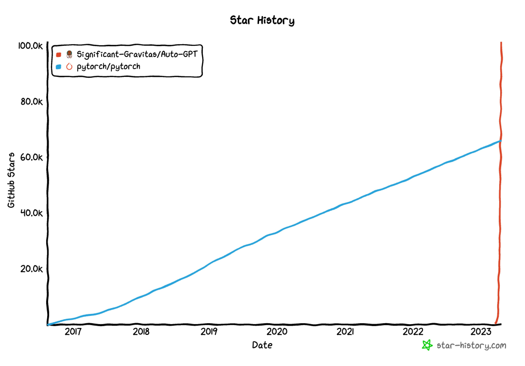 开源将剧烈地加快AI的发展,大家要做好心理准备自己随时受到AI冲击带来的“脑震荡”。AutoGPT在3个月不到的时间里Github的点赞数(Star)超过了100k,如果大家不能理解这个速度有多快,我们拿最出名的深度学习框架Pytorch和AutoGPT做对比:具体可以看下图两个项目的曲线。