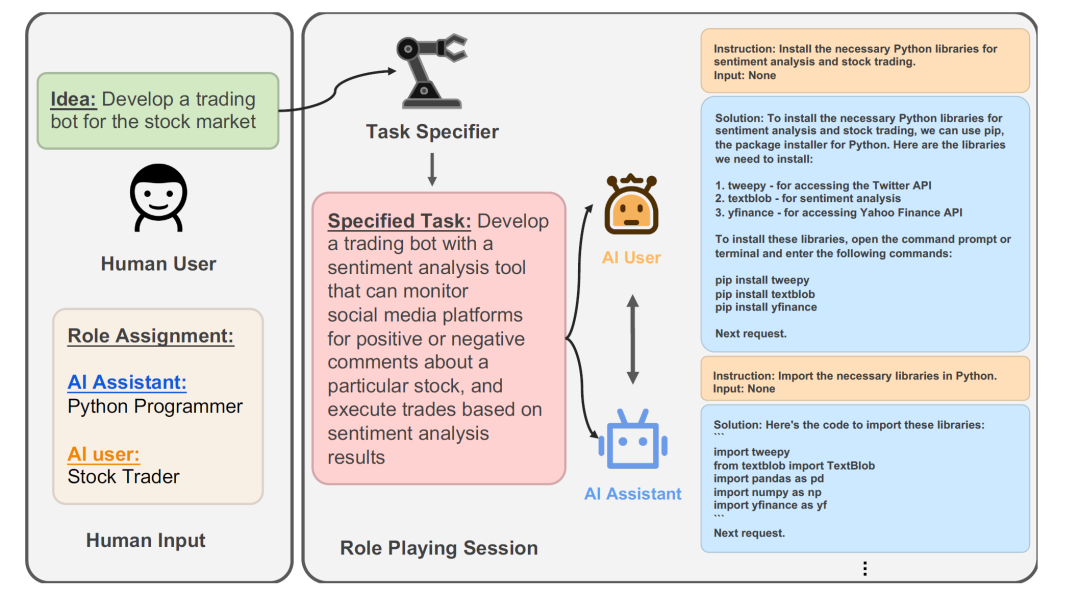 在Camel这篇论文里,我们能看到作者不是定义一个智能体的内部实现机制,而是用Prompt工程实现了多个角色来共同完成一个任务,同样都是“行动→观察结果→思考→决定下一步行动”,但它更多是通过角色之间的交流完成,你可以理解为一个角色PUA另外一个角色,甚至是两个角色相互PUA来完成任务。