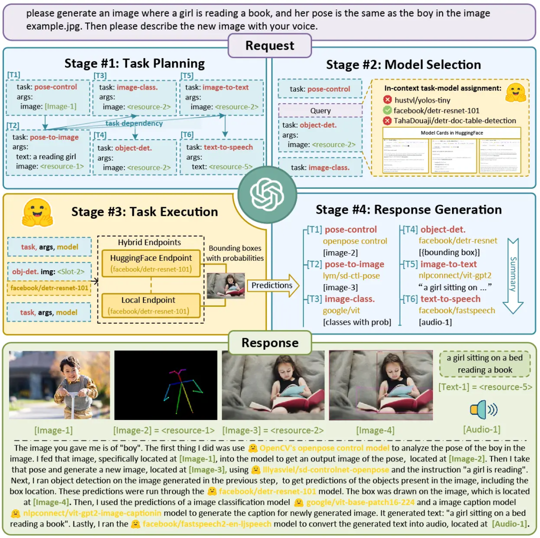 HuggingGPT 的工作流程包括四个阶段。从工作流程来看,HuggingGPT非常适合意图明确或者流程简单的任务,因为它在第一步决定了后面3步是什么,但最终结果会根据不同的预测得出结论。