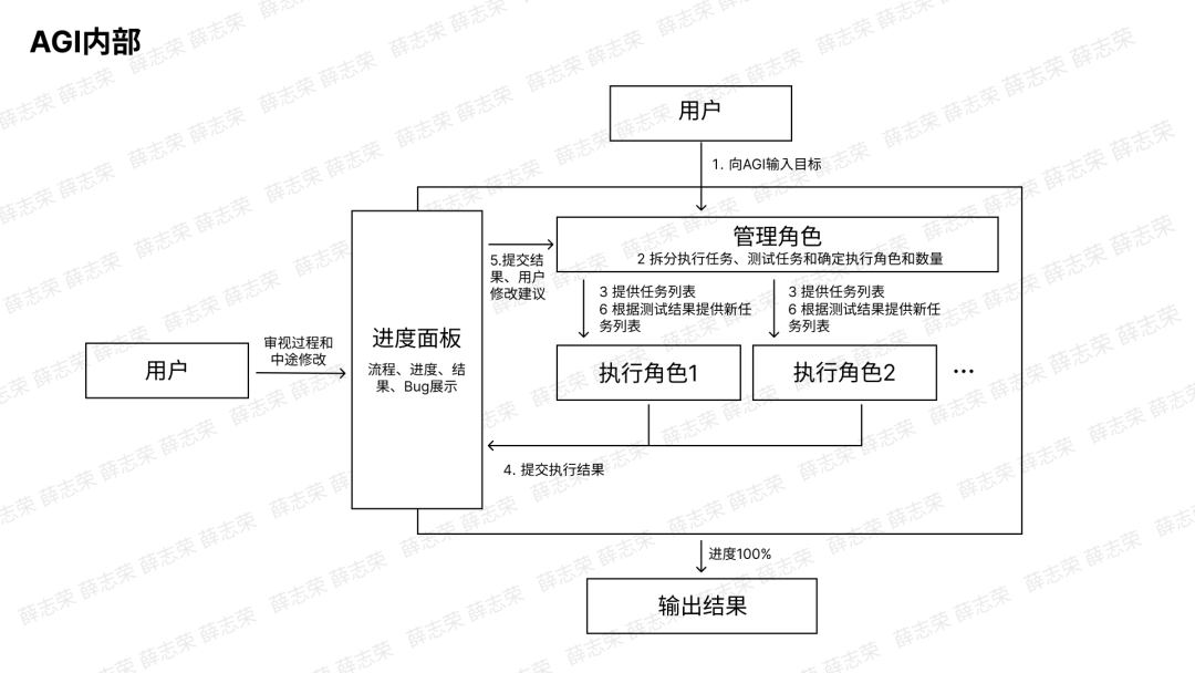 在AGI中我们会有多个角色在驱动任务的建立、执行和测试。为什么我们需要多个角色?我们可以理解为这是一条流水线,而流水线上的每一个员工都是单独个体,也就是各自处理数据相互不污染上下文,而且我们通过测试验证的方式决定了当前任务是否完成,例如这个任务有没有bug,如果有要自己重新修改(这个是不是有点像产品经理→程序员→测试员的流水线?)。为什么上文提及“相互不污染上下文”,我们这么理解:如果这个人自己新建任务以及自己执行任务,它是不是可以偷懒?所以用户是老板,用户把自己的目标传递给管理者,管理者指定计划并让下面的员工执行,最后管理者为结果负责。 在这里我增加了“进度面板”这个新概念, 这方便用户随时修改、优化和终止任务,甚至是在中途帮助AGI解决一些它们自己解决不了的问题。