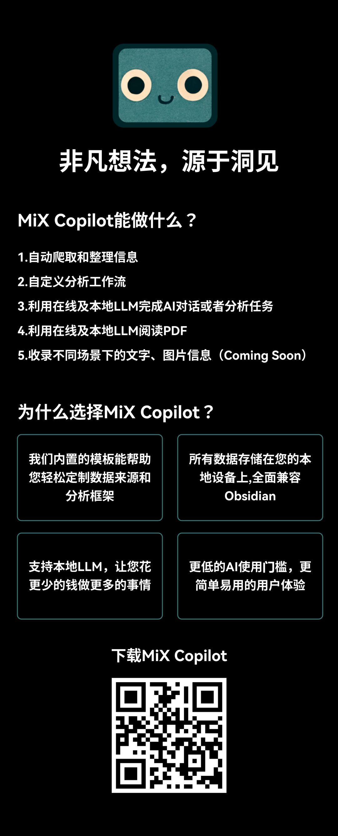 什么是MiX Copilot?MiX Copilot目前是一款使用LLM以及各种AI技术实现信息收集和分析的桌面端软件, 可以在Windows和MacOS上运行 。我们的Slogan是“ Effortlessly Transforming Intelligence into Extraordinary Ideas ”,这里的Intelligence不仅是智能,也是指情报。这里的相关解读请参考我的上一篇文章 [ “重新理解Intelligence” ](http://mp.weixin.qq.com/s?__biz=MzAxOTI4OTg3Mg==&mid=2649348703&idx=1&sn=07ebbae95816d1017a451e8c4167d44f&chksm=83d43820b4a3b1365dd341d7c312ac9c27f83c613338f1f0758faefcc139b4cdd7c9d0c70e64&scene=21#wechat_redirect) 。