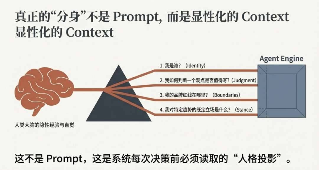 在我的实践中,这些东西被写成一组 Context 文件。它们定义了:我是谁、我怎么判断一个观点是否值得写、我的品牌红线是什么、我对某个趋势的立场是什么。系统里的每一个 Agent 在做决策之前,都会先读取这些文件。