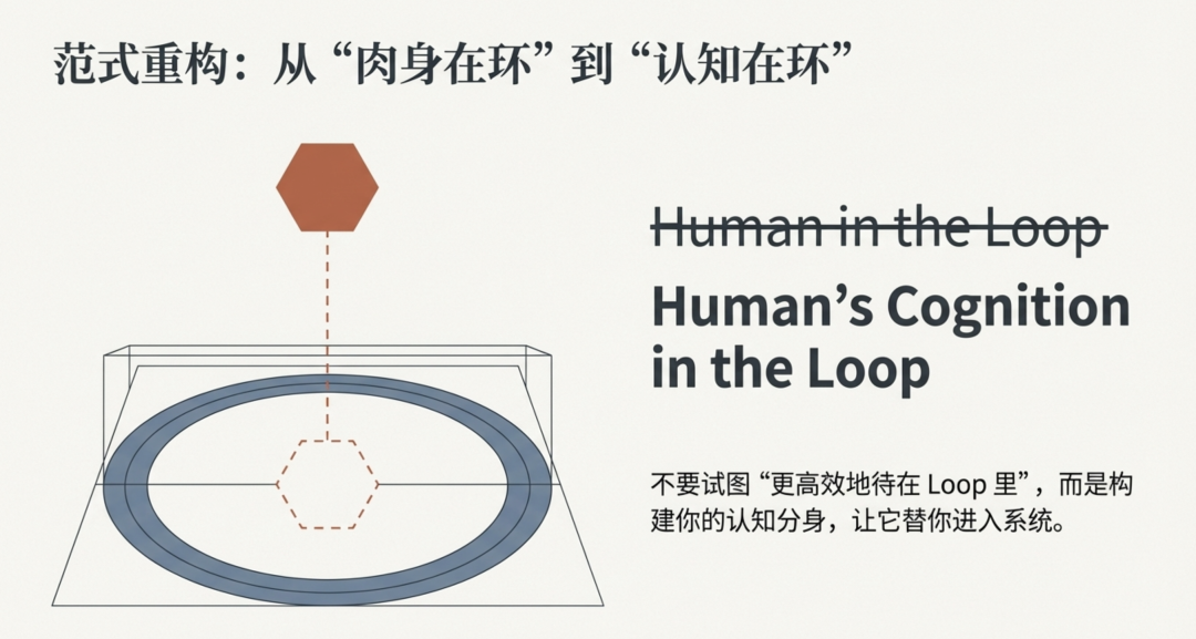 这可能是一个值得认真讨论的范式转换:从"人在回路中"到"人的认知在回路中"。前者要求你在场,后者要求你把自己说清楚。