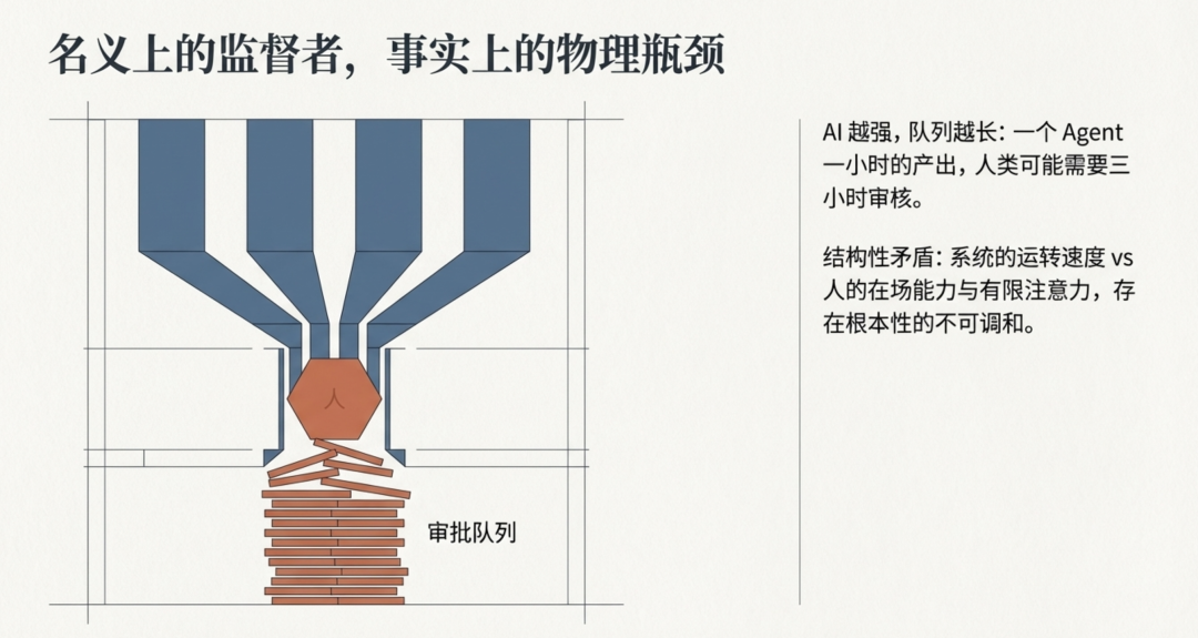 AI 越强大、越自动化,这个问题越严重。 因为 AI 产出的速度远超人类审批的速度。一个 Agent 一小时能产出的东西,你可能要花三小时审核。